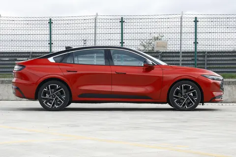 车身侧面的溜背线条从B柱开始自然下滑,一直延伸到车尾,没有生硬的转折,让整车看起来更修长。车窗的镀铬饰条做得细窄,不会显得浮夸,刚好勾勒出车窗轮廓。轮毂是多辐式造型,线条简洁有力,转动起来视觉效果很和谐,搭配的轮胎尺寸适中,既保证了抓地力,又不会因为太宽而显得突兀。车门下方的内凹设计,不仅让侧面线条更有立体感,还能在一定程度上减少行驶噪音,这些小细节考虑得挺周全。