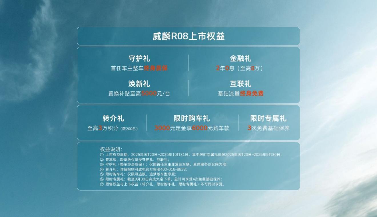 在智能体验上,威麟R08也向新能源看齐,拥有越级的科技体验。同级最大15.6英寸视网膜大屏+车规级8155芯片,支持500ms极速语音响应与多指令连续执行;不仅如此,威麟R08全系标配车联网与APP远程控制,远程控制不只楼上楼下的距离,跨时区也能操作。还有360°环视与180°底盘透视,窄巷会车实时预测轨迹,越野途中洞察坑石隐患。