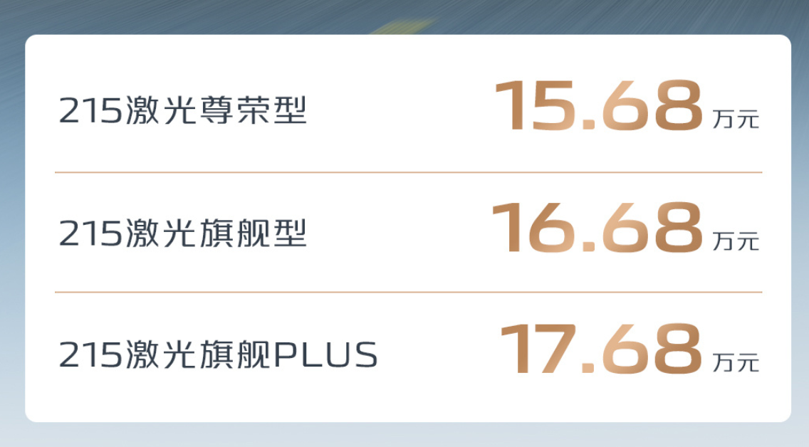 动力部分,新车型依旧采用智慧新蓝鲸3.0动力系统,搭载1.5L/1.5T发动机与单电机组成的插电式混合动力系统。其中,215激光尊荣型搭载1.5L插混系统,系统综合功率237kW,系统综合扭矩455N·m;215激光旗舰型和215激光旗舰PLUS均搭载1.5T插混系统,系统综合功率275kW,系统综合扭矩550N·m。三款新车型均配备容量为31.7kWh磷酸铁锂电池,CLTC工况纯电续航里程为215km。