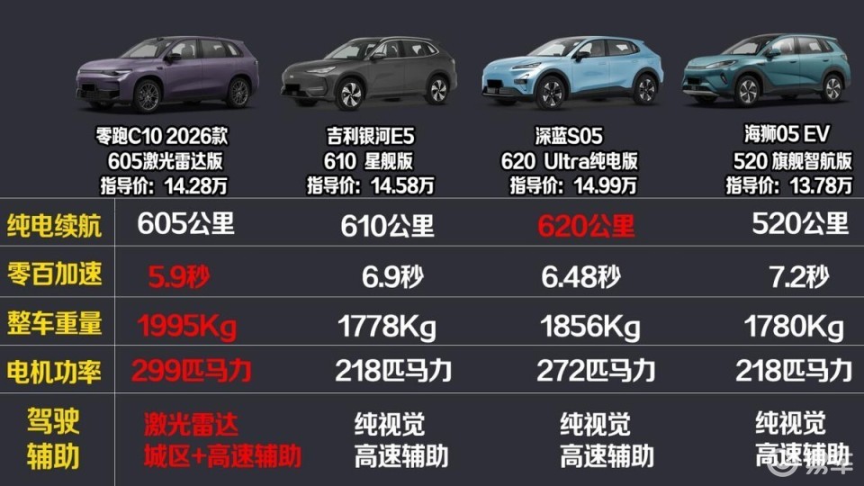 配置方面,四款车型对比之下,26款零跑C10唯一搭载800V平台架构、唯一配备激光雷达辅助驾驶,支持城市领航辅助驾驶、后置单机马力最大(299匹)、零百加速度最快(5.9秒)的车型。真要放在一起对比,其实你能发现,零跑C10并不是每一项都“压人一头”,它是综合实力的六边形战士,方面都均等。